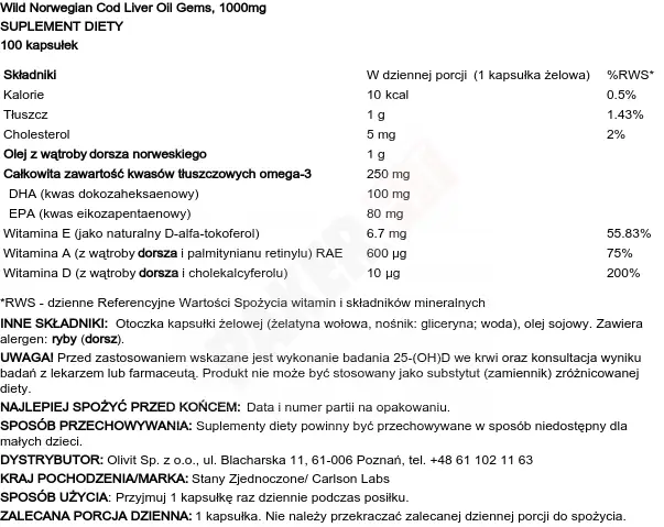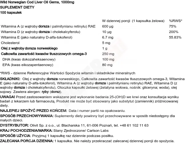 Carlson Labs Wild Norwegian Cod Liver Oil 460mg - 150+ 30 Kapsułek