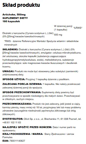 Data Ważności 09.2025 Jarrow Formulas Artichoke 500mg 180 Vcaps