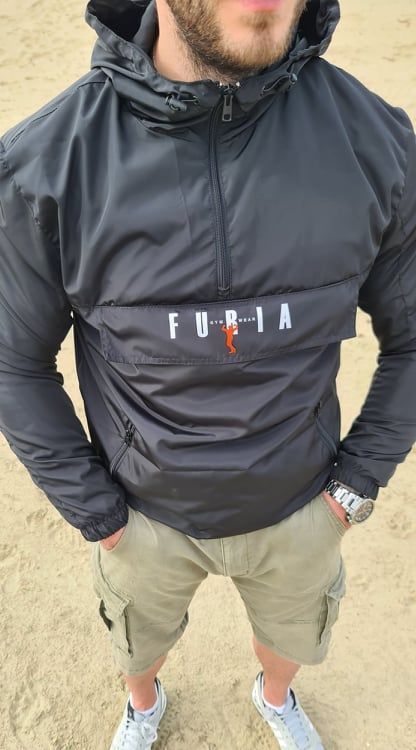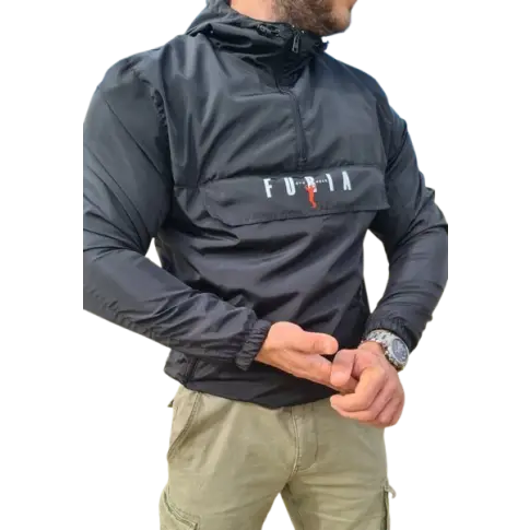 Kurtka męska z ortalionu, kangurka z logiem Furii. Kurtka z kapturem, rozpinana z przodu częściowo, kieszenie po bokach plus na środku pod napisem.