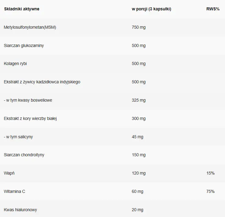Składniki: Metylosulfonylometan(MSM), siarczan glukozaminy, kolagen rybi, ekstrakt z żywicy kadzidłowca indyjskiego (Boswelia Serrata), ekstrakt z kory wierzby białej, siarczan chondroityny, sól wapniowa kwasu fosforowego(wapń), kwas L-askorbinowy(witamina C), kwas hialuronowy, substancja wypełniająca: celuloza mikrokrystaliczna; substancja przeciwzbrylająca: sole magnezowe kwasów tłuszczowych; kapsułka: otoczka - żelatyna.