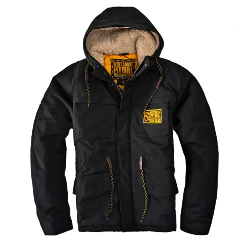 Średniej długości, ciepła kurtka z kapturem w militarnym stylu. Wykonana z grubej tkaniny nylonowej powlekanej wodoodporną warstwą. Ocieplana podszewka pikowana podwójnym szwem. Kaptur wykończony barankiem. Cztery zapinane na rzepy kieszenie na przodzie kurtki.