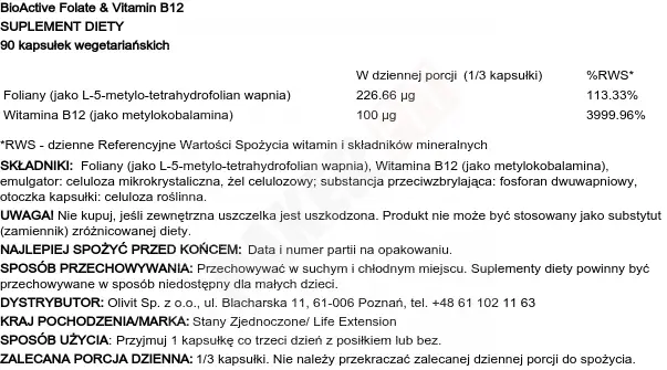 Life Extension Bioactive Folate Vitamin B12 90 Vcaps