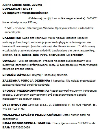 Now Foods Alpha Lipoic Acid 250 Mg - Zmiatacz Wolnych Rodników* - 60 Kapsułek Wegetariańskich