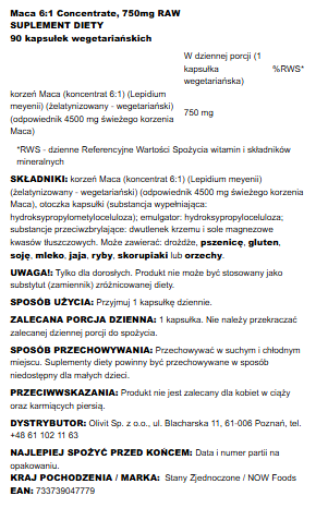 Now Foods Maca 750 Mg Raw - 90 Kapsułek Wegetariańskich