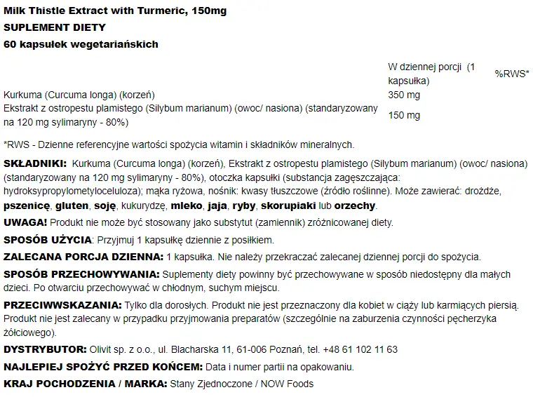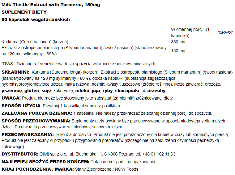 Now Foods Milk Thistle Extract with Turmeric 150mg - 60 vcaps