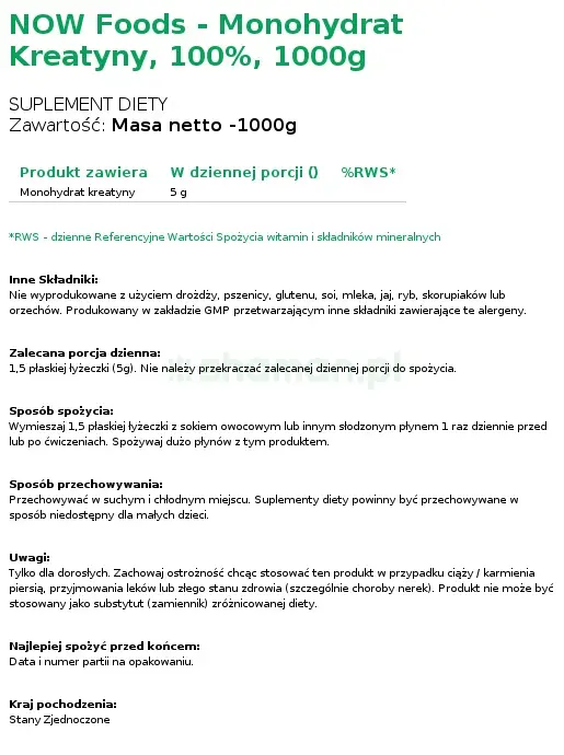 Now Foods - Monohydrat Kreatyny 100% 1000g