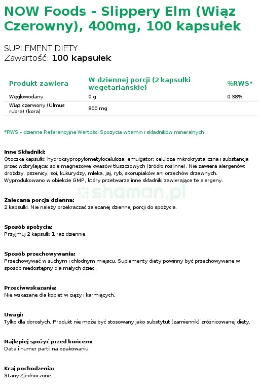 Now Foods - Slippery Elm (Wiąz Czerowny) 400mg 100 Kapsułek