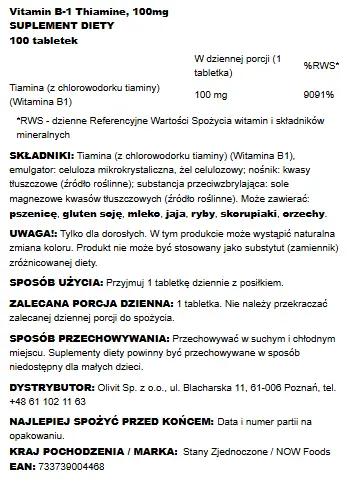 Now Foods Vitamin Witamina B-1 Thiamine 100 Mg - 100 Tabletek
