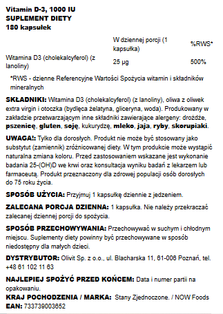 Now Foods Witamina D-3 1,000 Iu - 180 Kapsułek