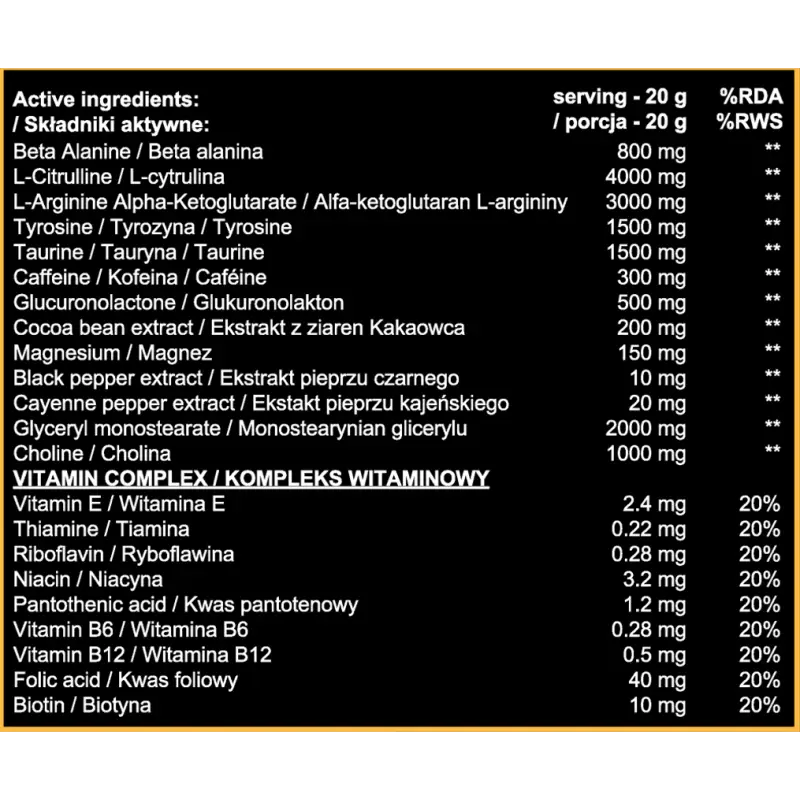 Dawkowanie: 1 miarka produktu lub jedna saszetka 20g, rozpuścić w 200ml wody. Spożywać około 30 minut przed treningiem.