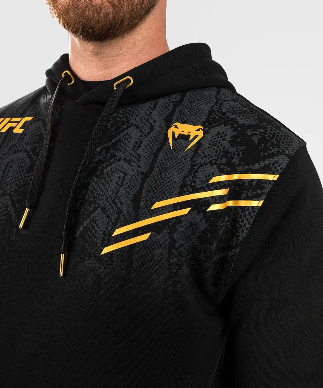 Męska bluza z kapturem UFC Adrenaline by Venum Replica ma subtelną grafikę wężowej skóry na przednich ramionach i klatce piersiowej oraz złote logo Venum i UFC. Czarno-złota kolorystyka jest zarezerwowana dla mistrzów.