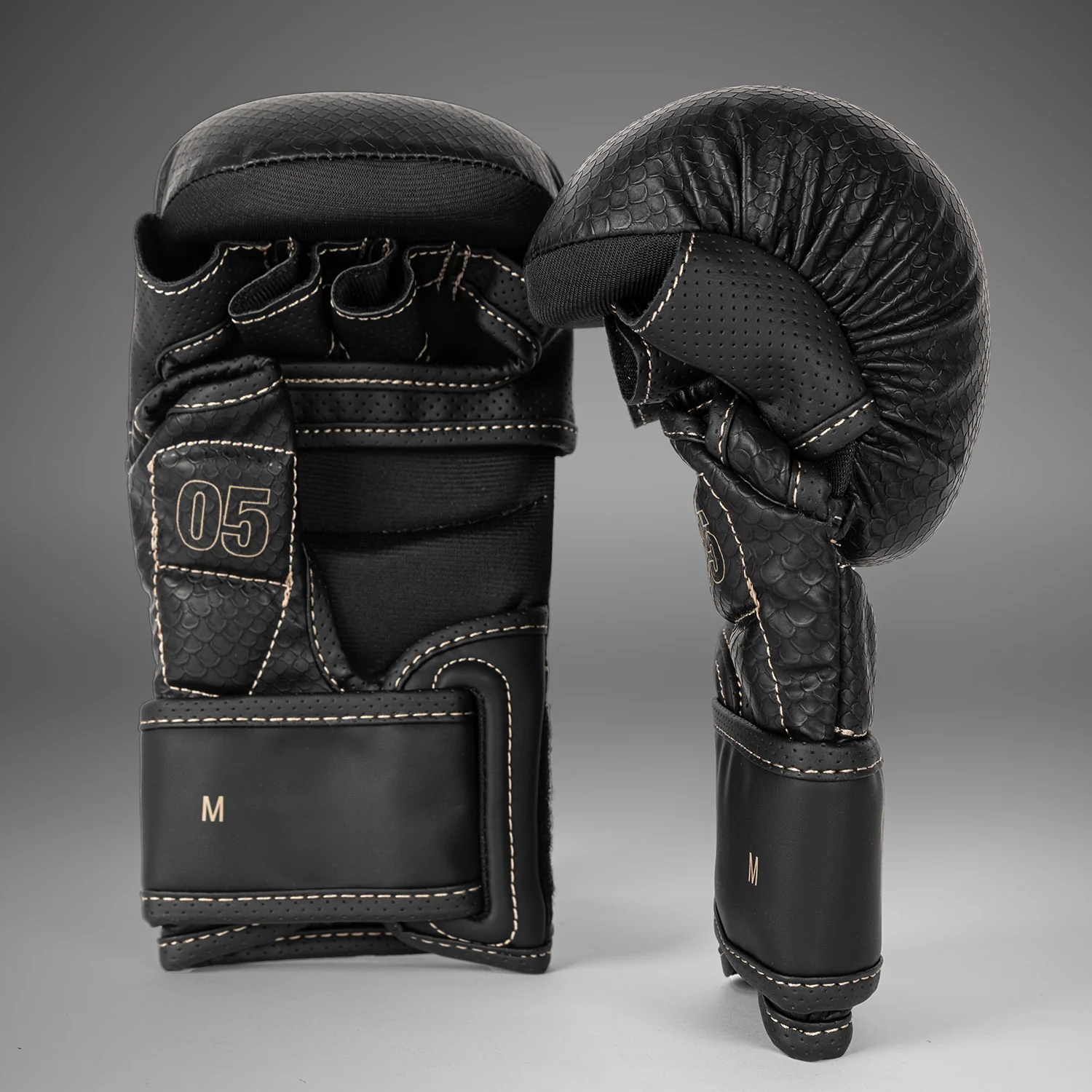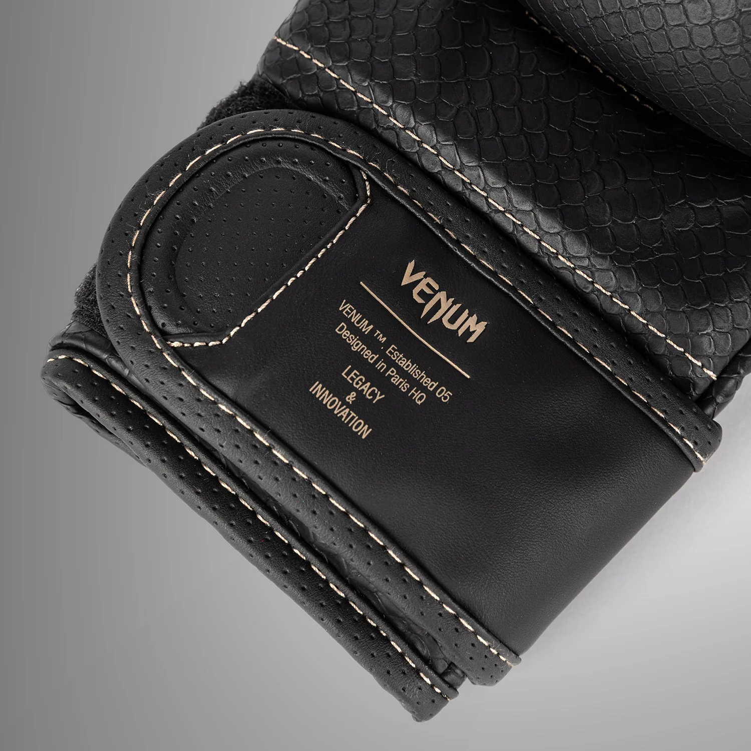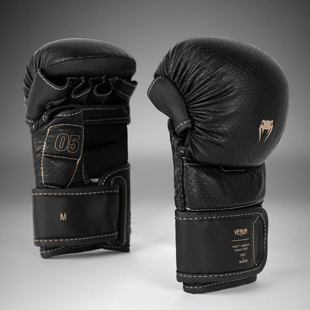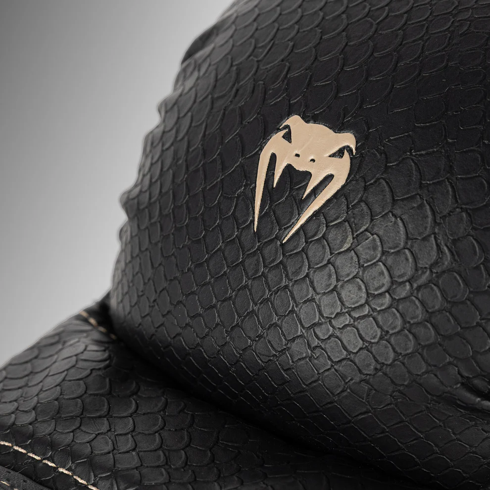 Beżowe szwy nawiązują do anatomicznej konstrukcji rękawic, tworząc subtelny kontrast. Teksturowane łuski rozłożone na powierzchni przypominają o konieczności uderzania mocno i szybko z Venum.