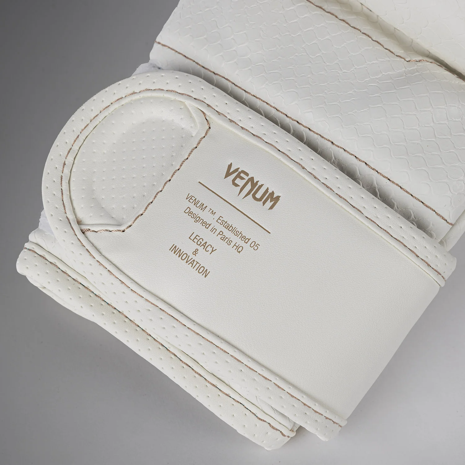 Beżowe szwy nawiązują do anatomicznej konstrukcji rękawic, tworząc subtelny kontrast. Teksturowane łuski rozłożone na powierzchni przypominają o konieczności uderzania mocno i szybko z Venum.